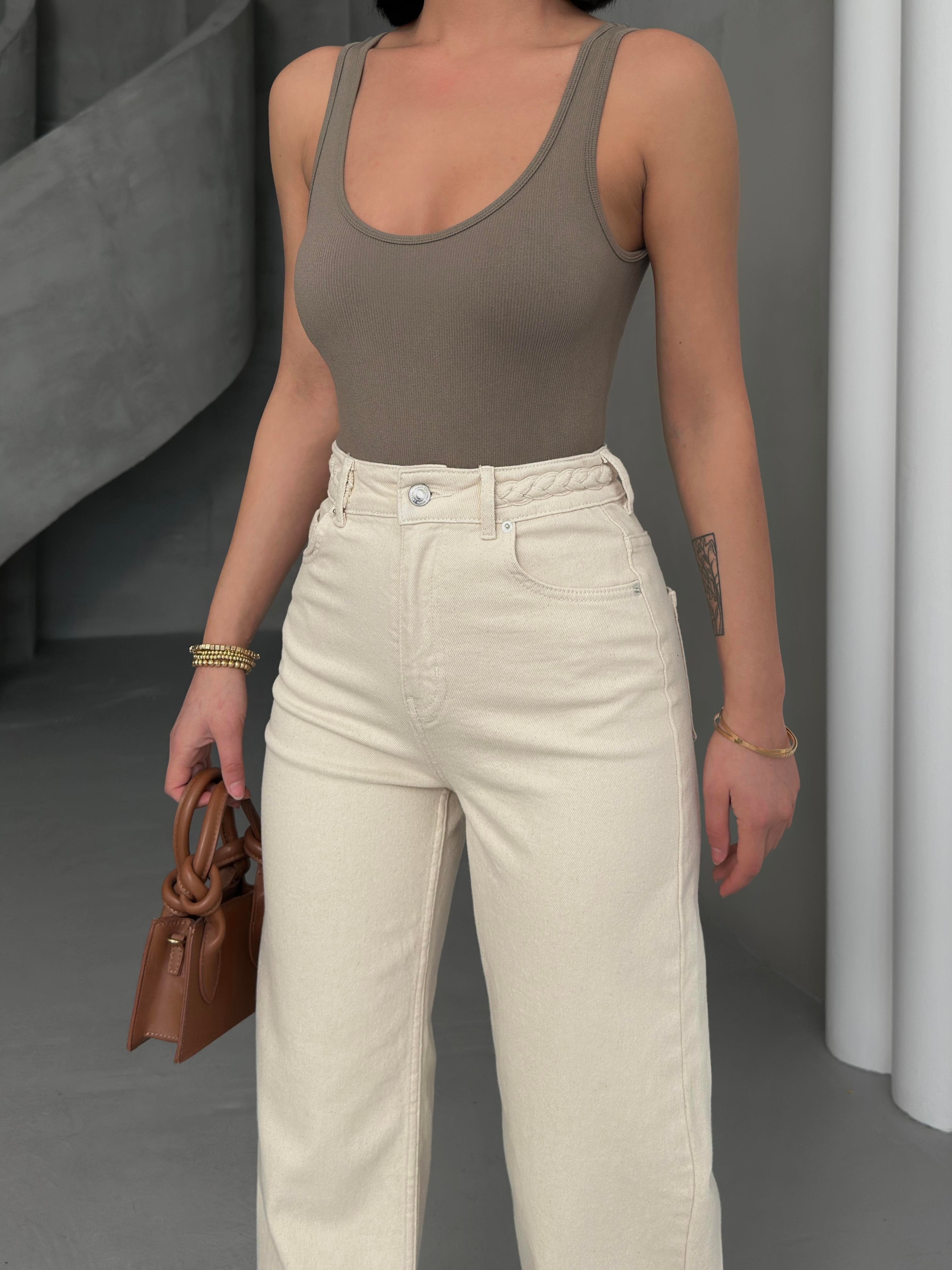 Women's High Waist Loose Cut Natural Belt Knit Detailed Jean Pants