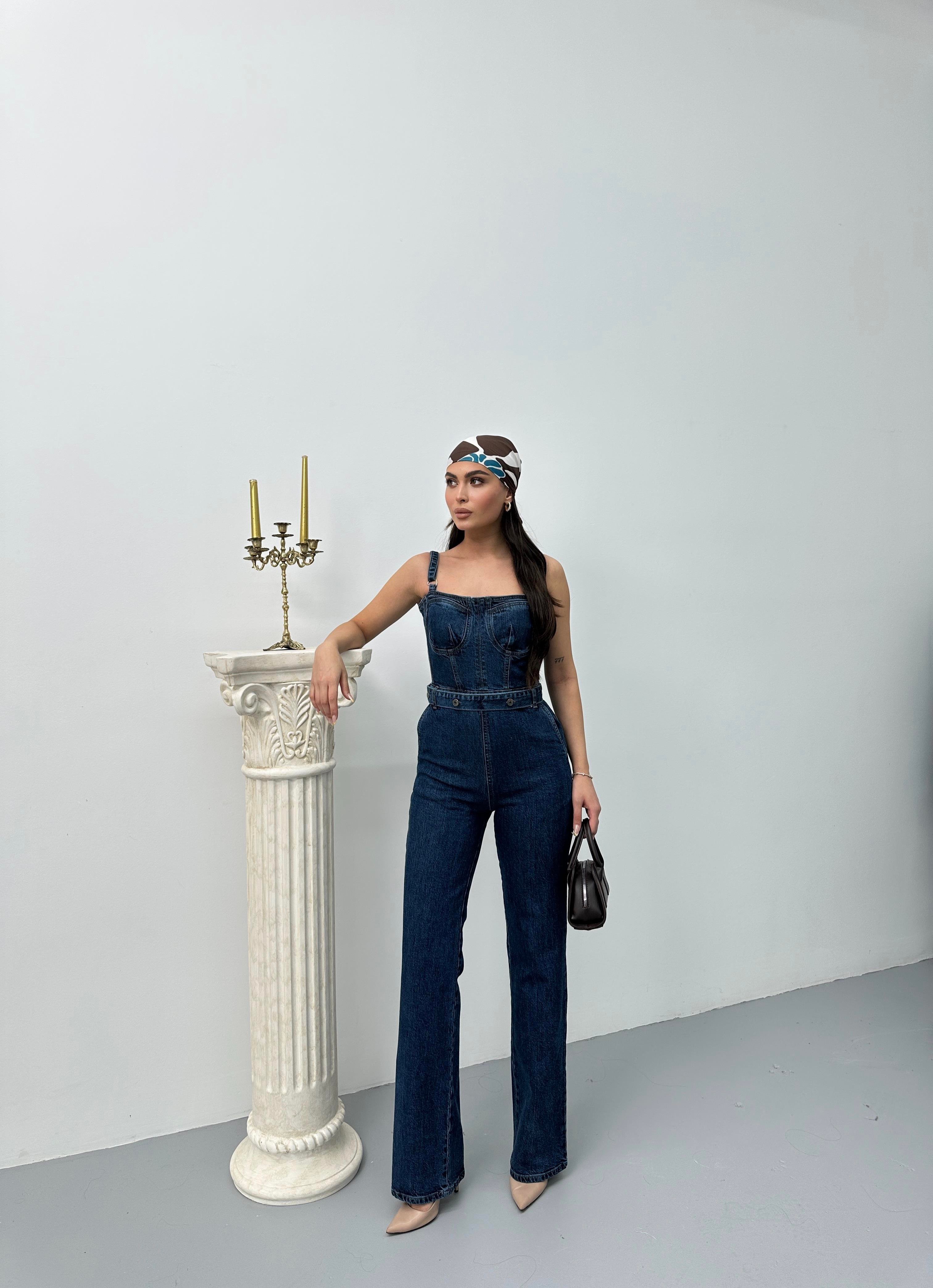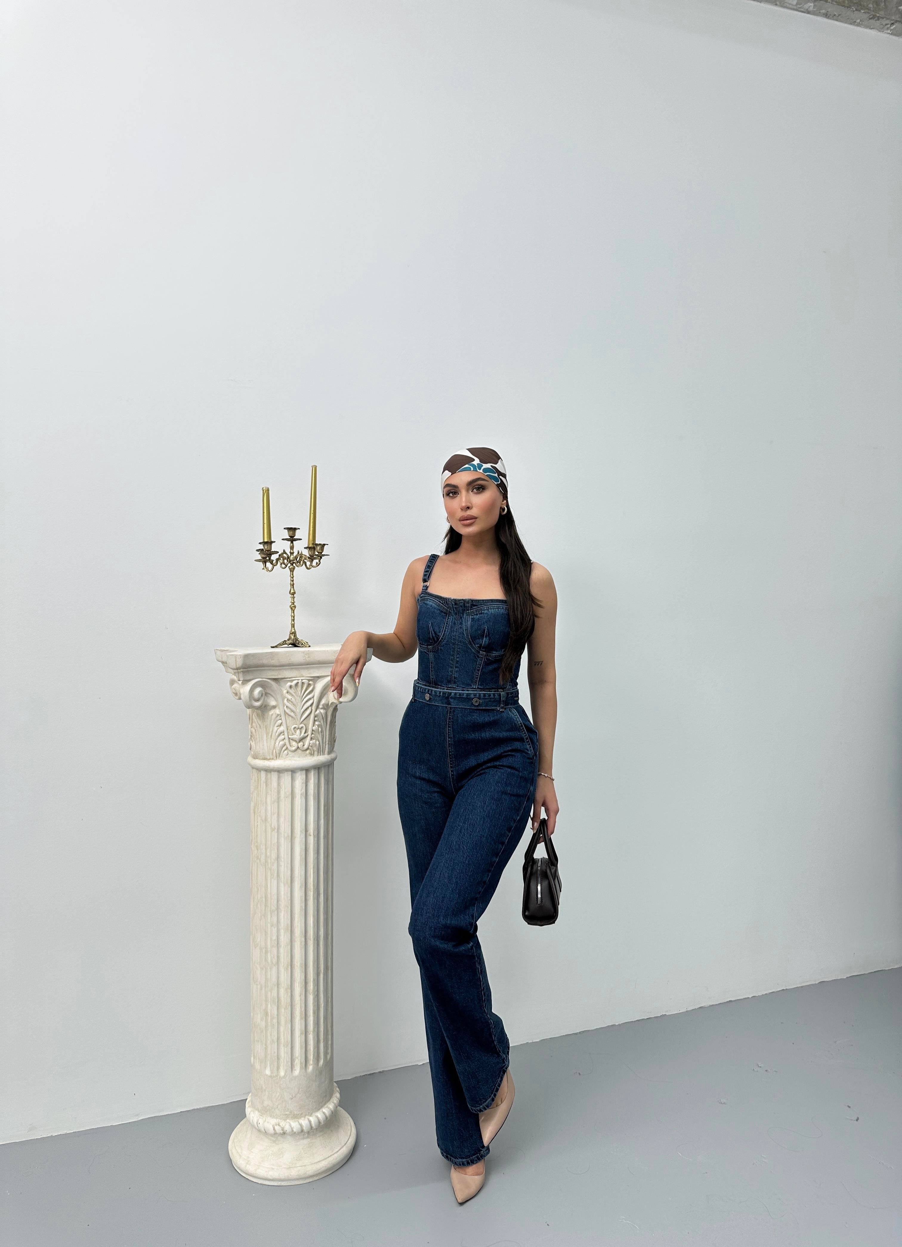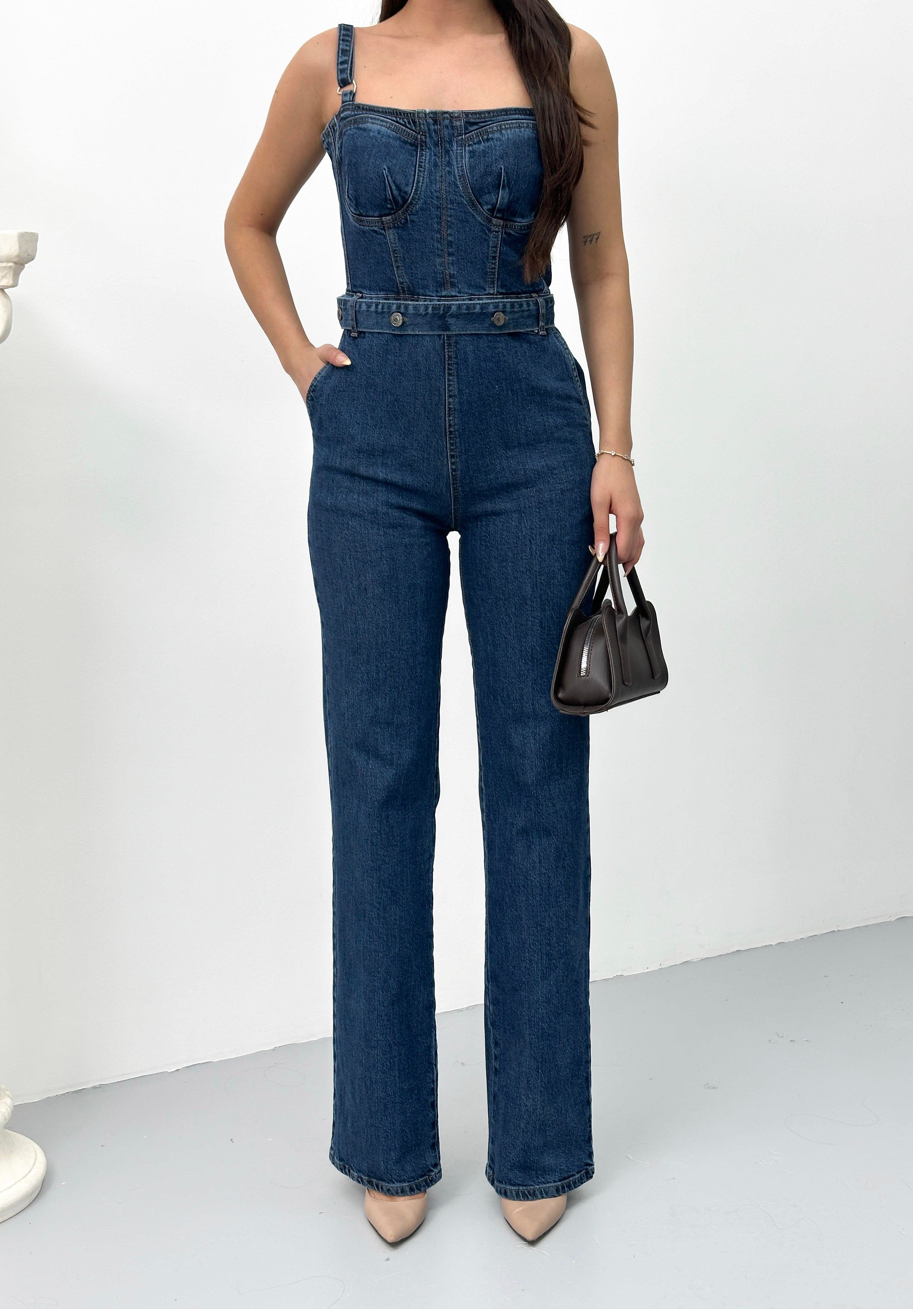 Shoulder Strap Waist Belt Detailed Dark Blue Jean Jumpsuit (TULUM-8017-34)