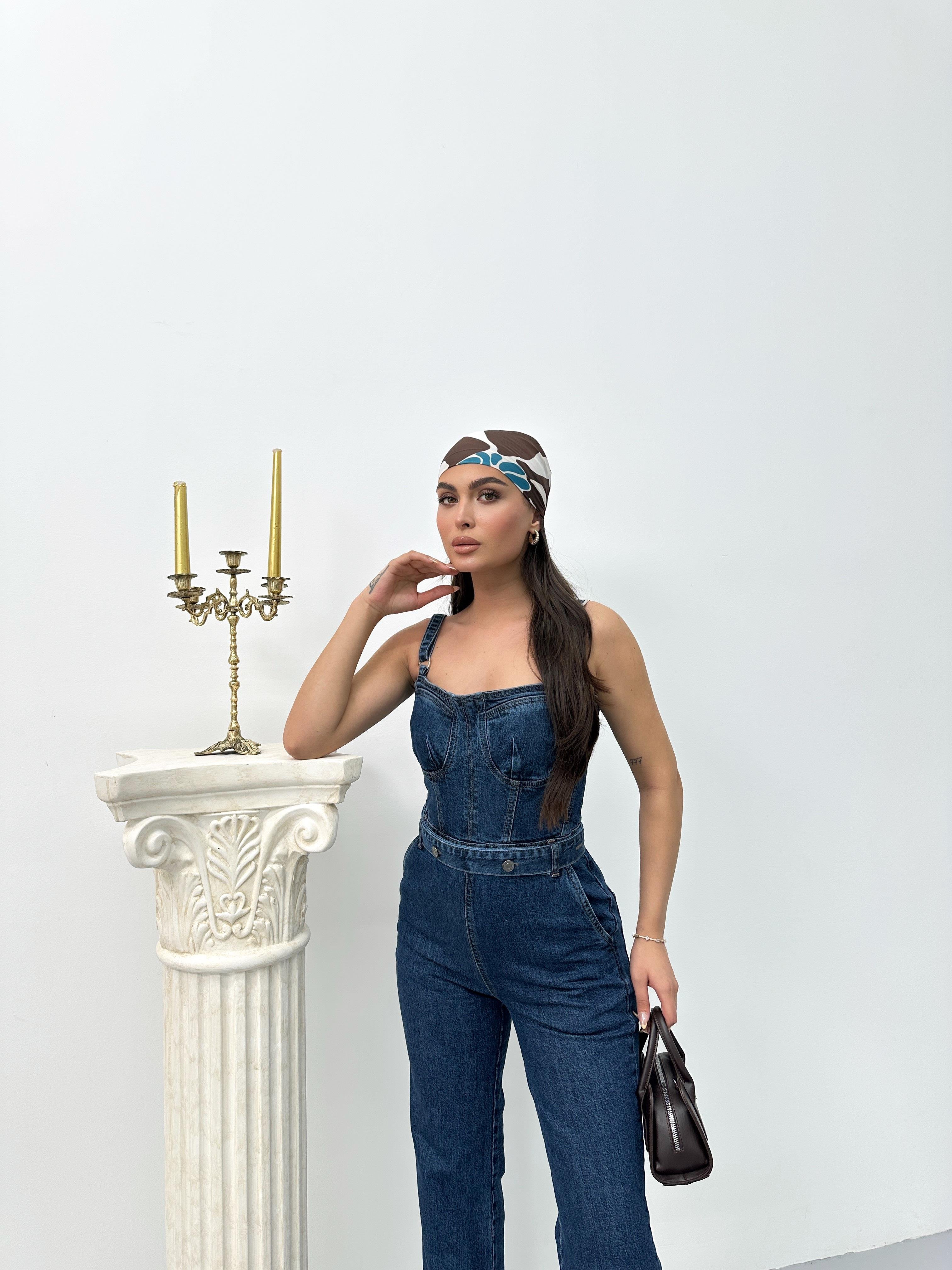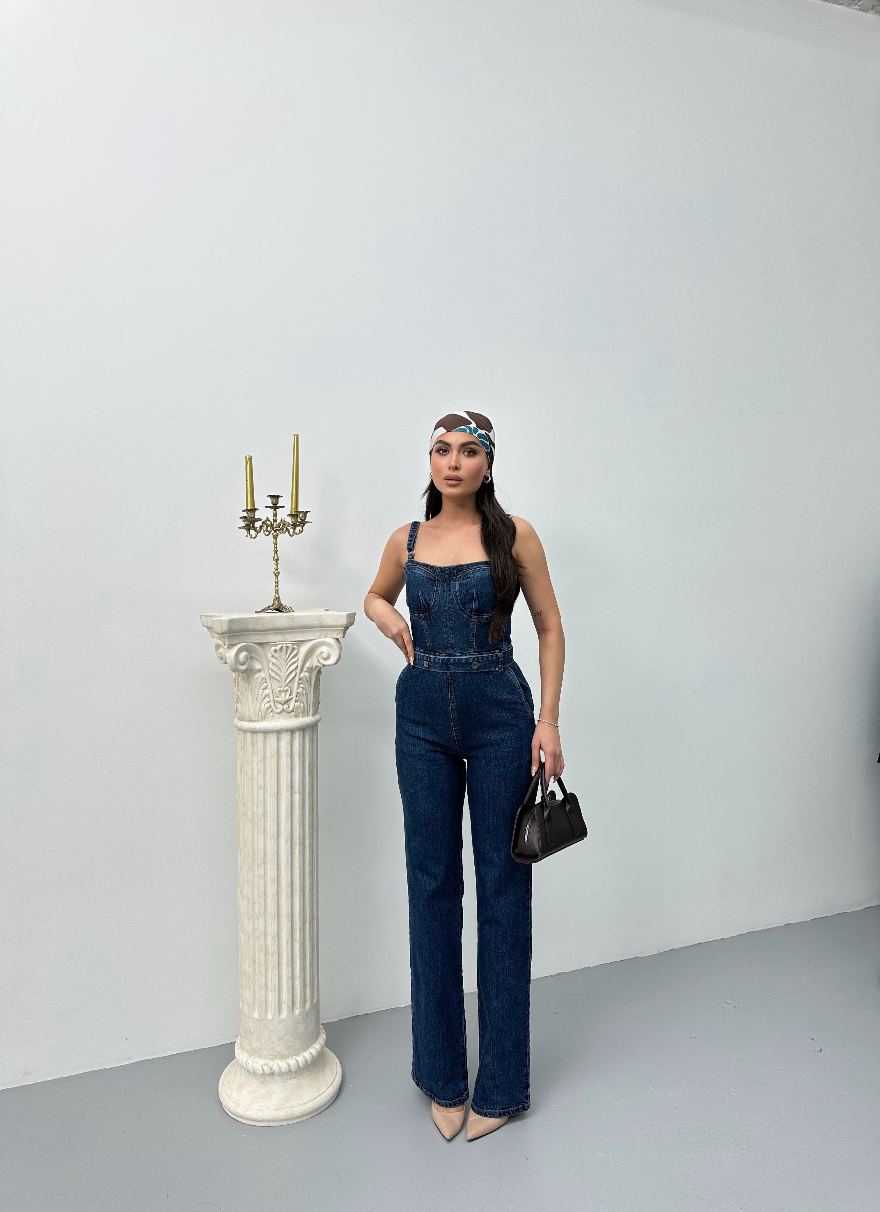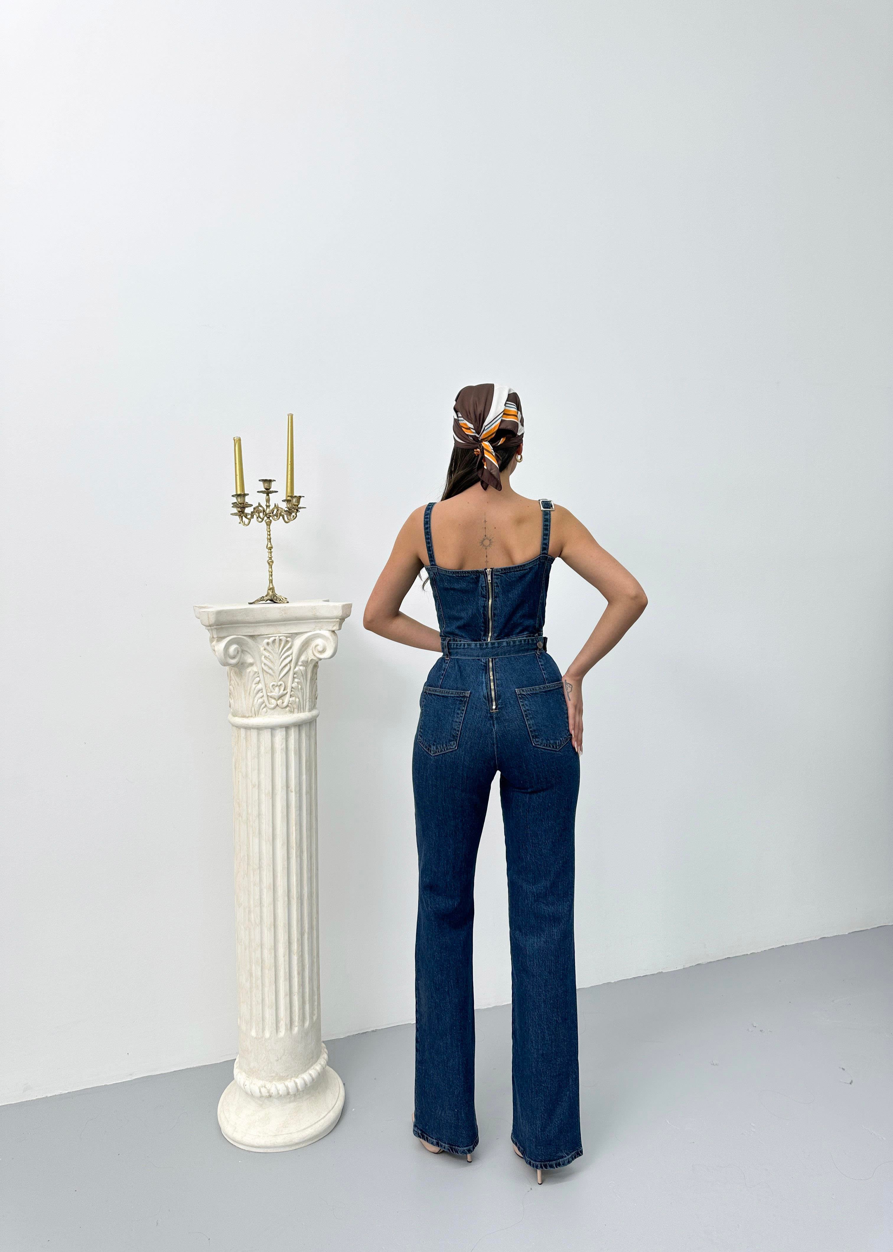 Shoulder Strap Waist Belt Detailed Dark Blue Jean Jumpsuit (TULUM-8017-34)