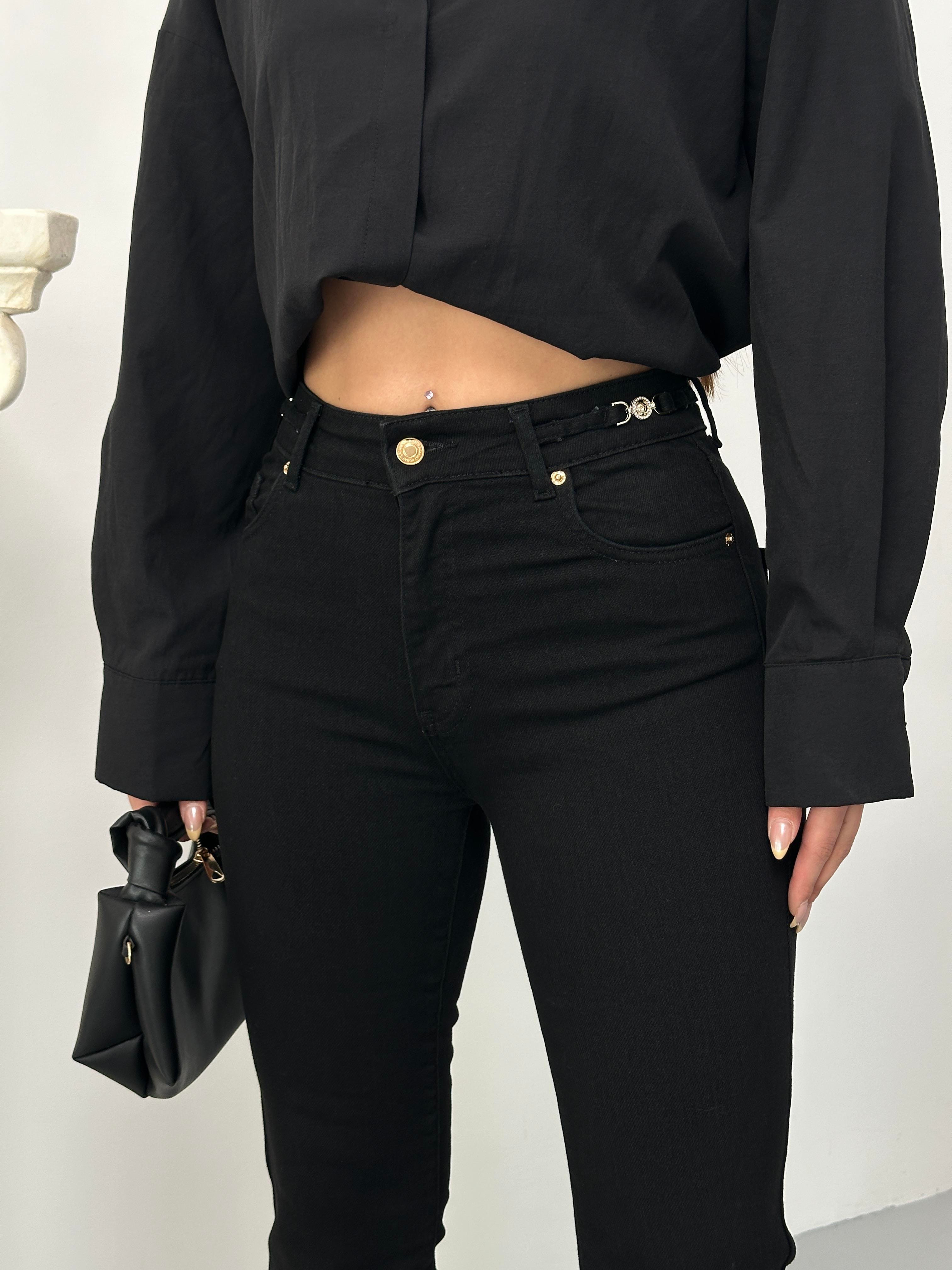 High Waist Belt Buckle Detailed Half Spanish Leg Black Jeans