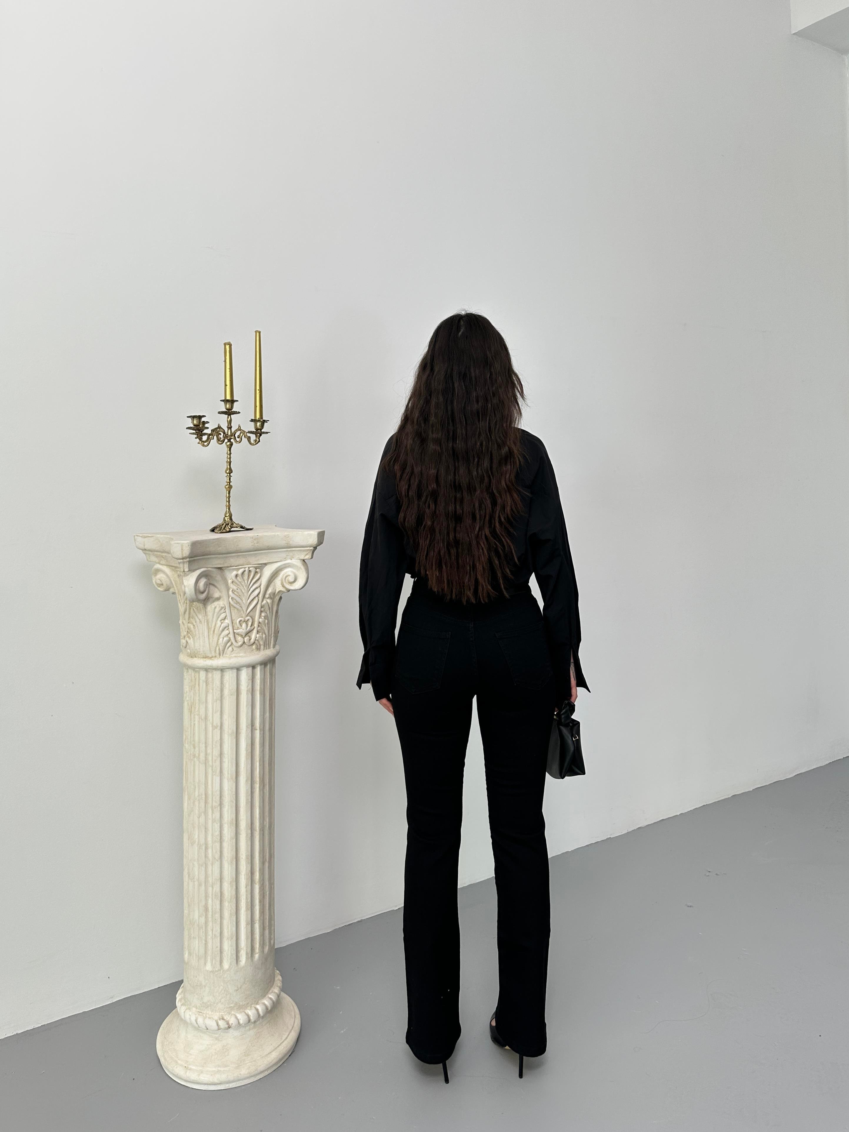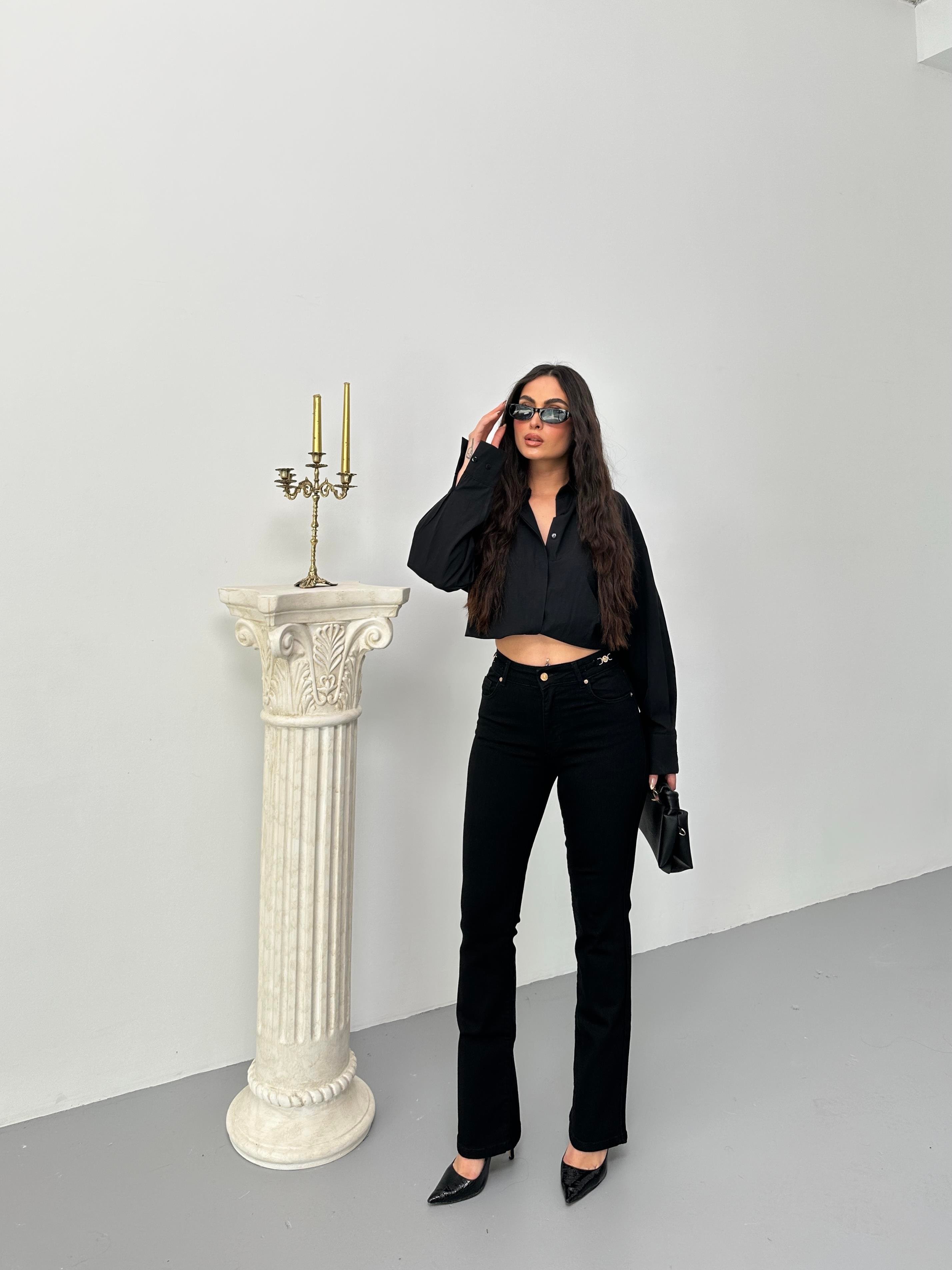 High Waist Belt Buckle Detailed Half Spanish Leg Black Jeans (BOOTCUTFLARE-8022-34)