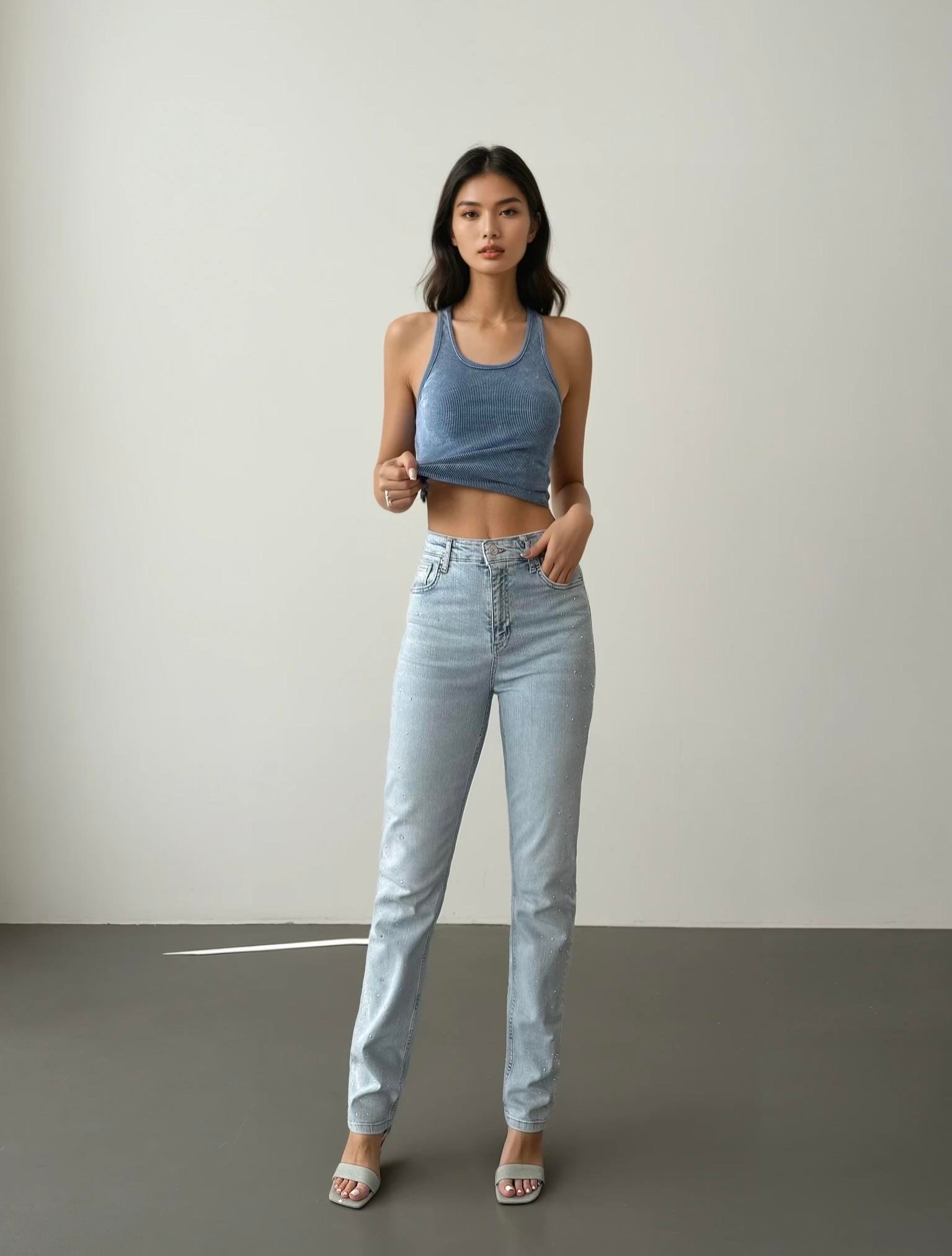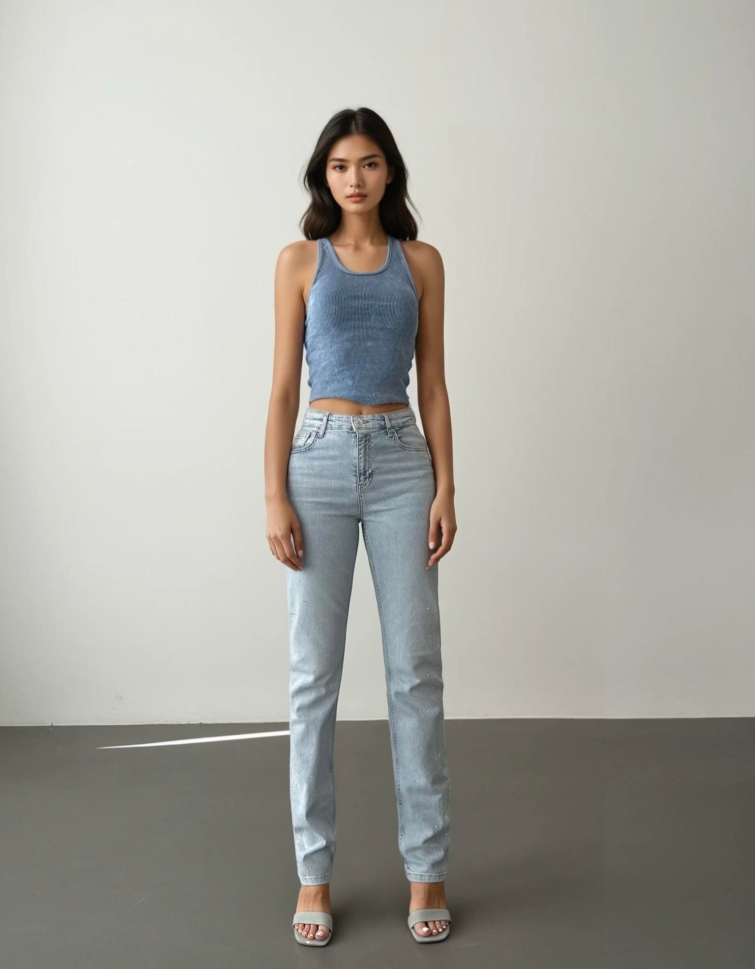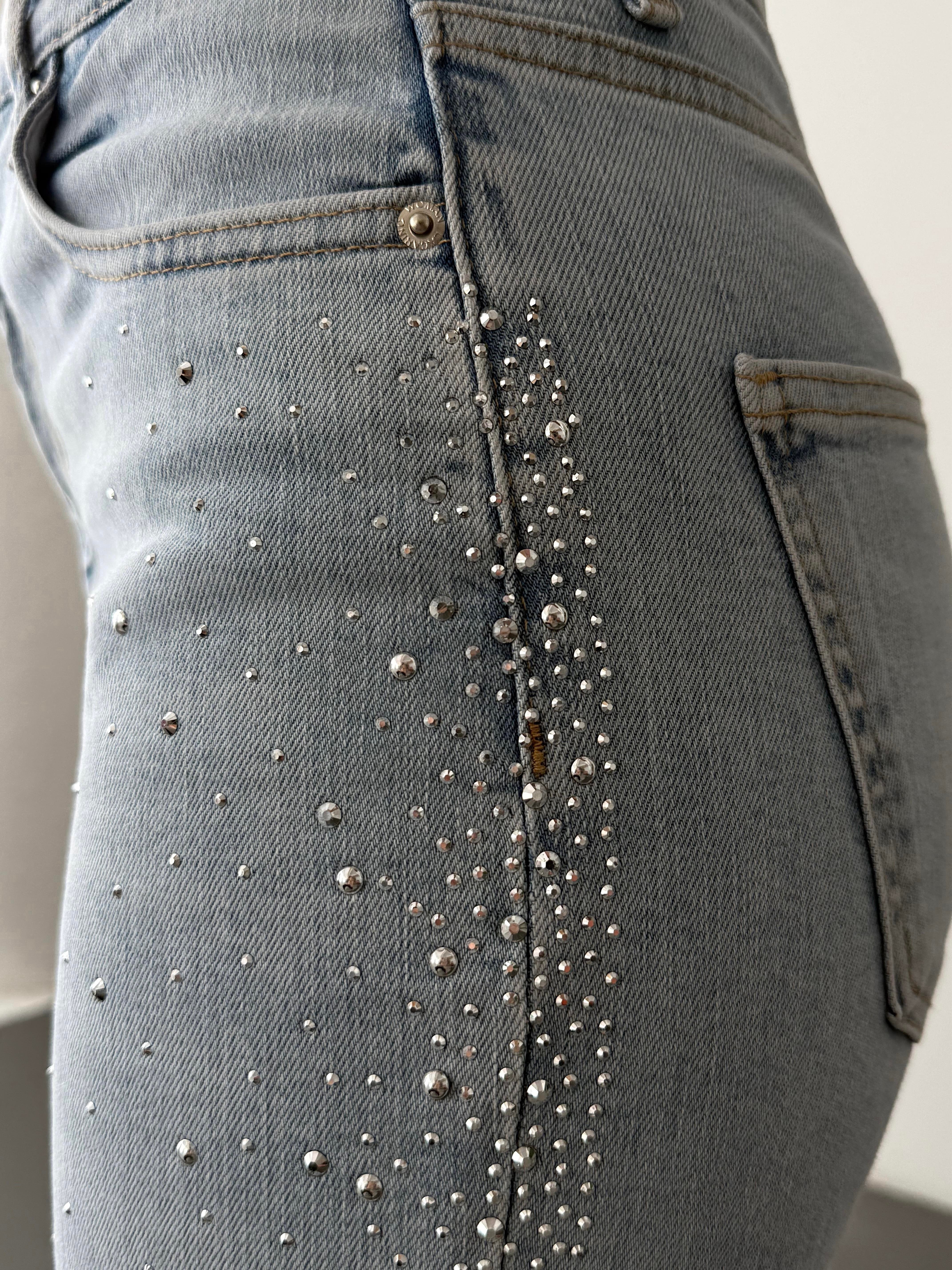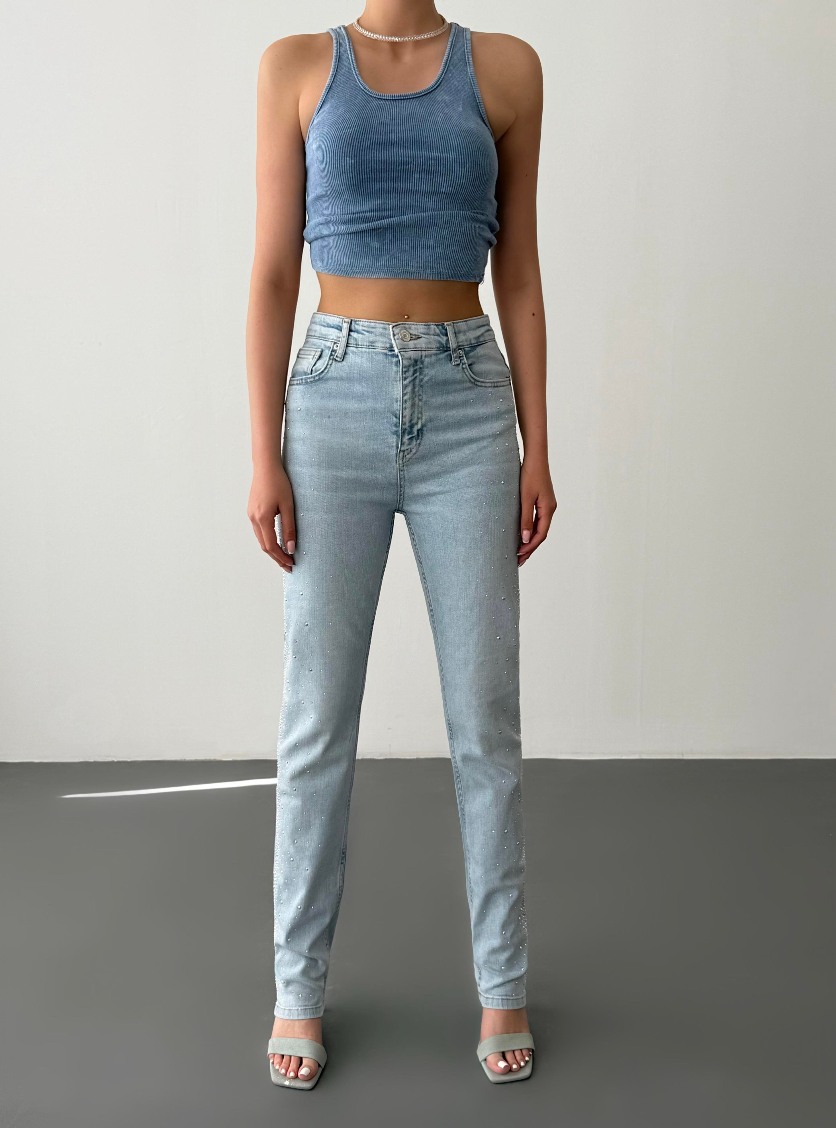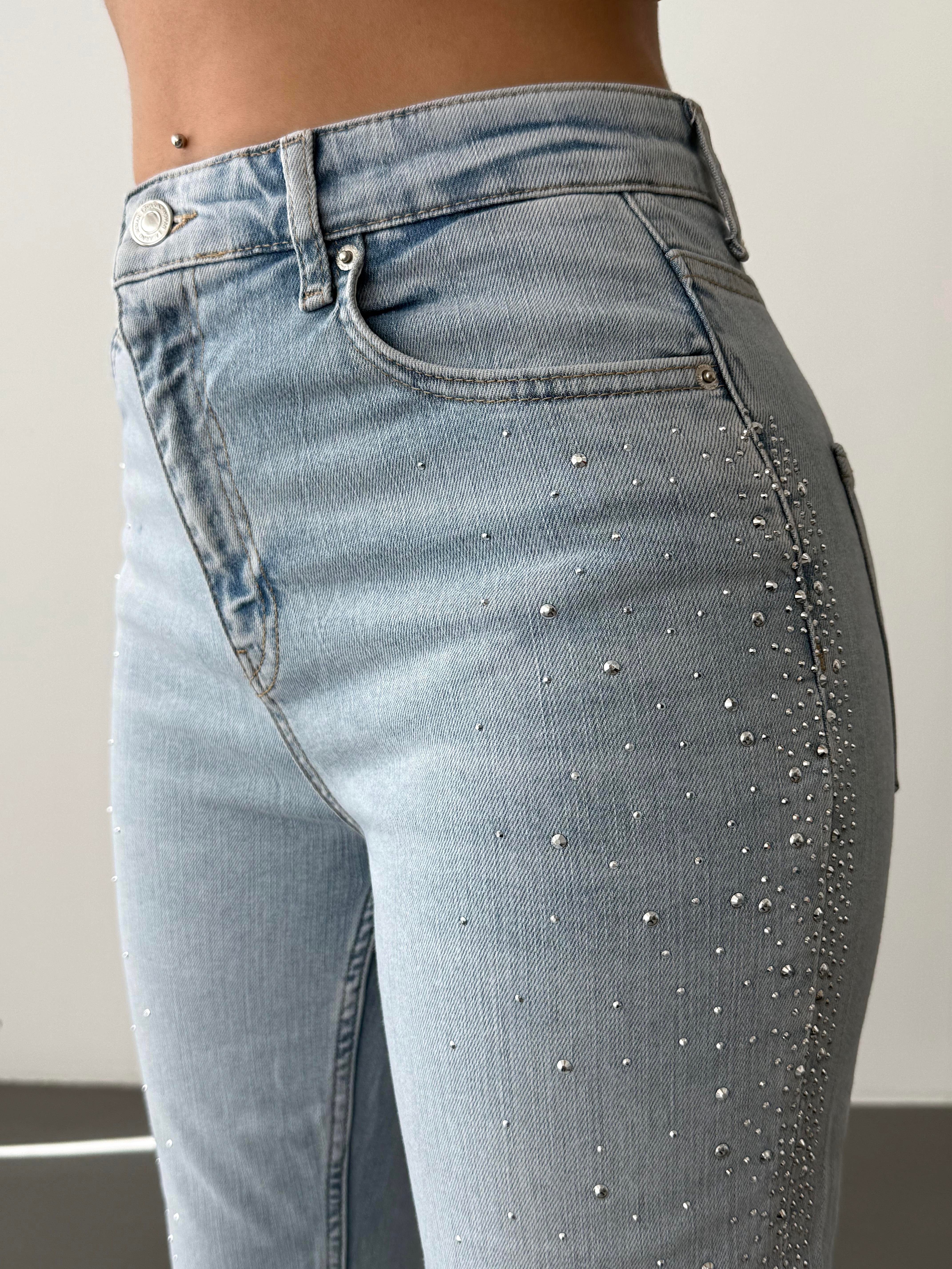 Джинсы прямого кроя цвета ''айс блю'' (ледяной синий) с деталями из камней.