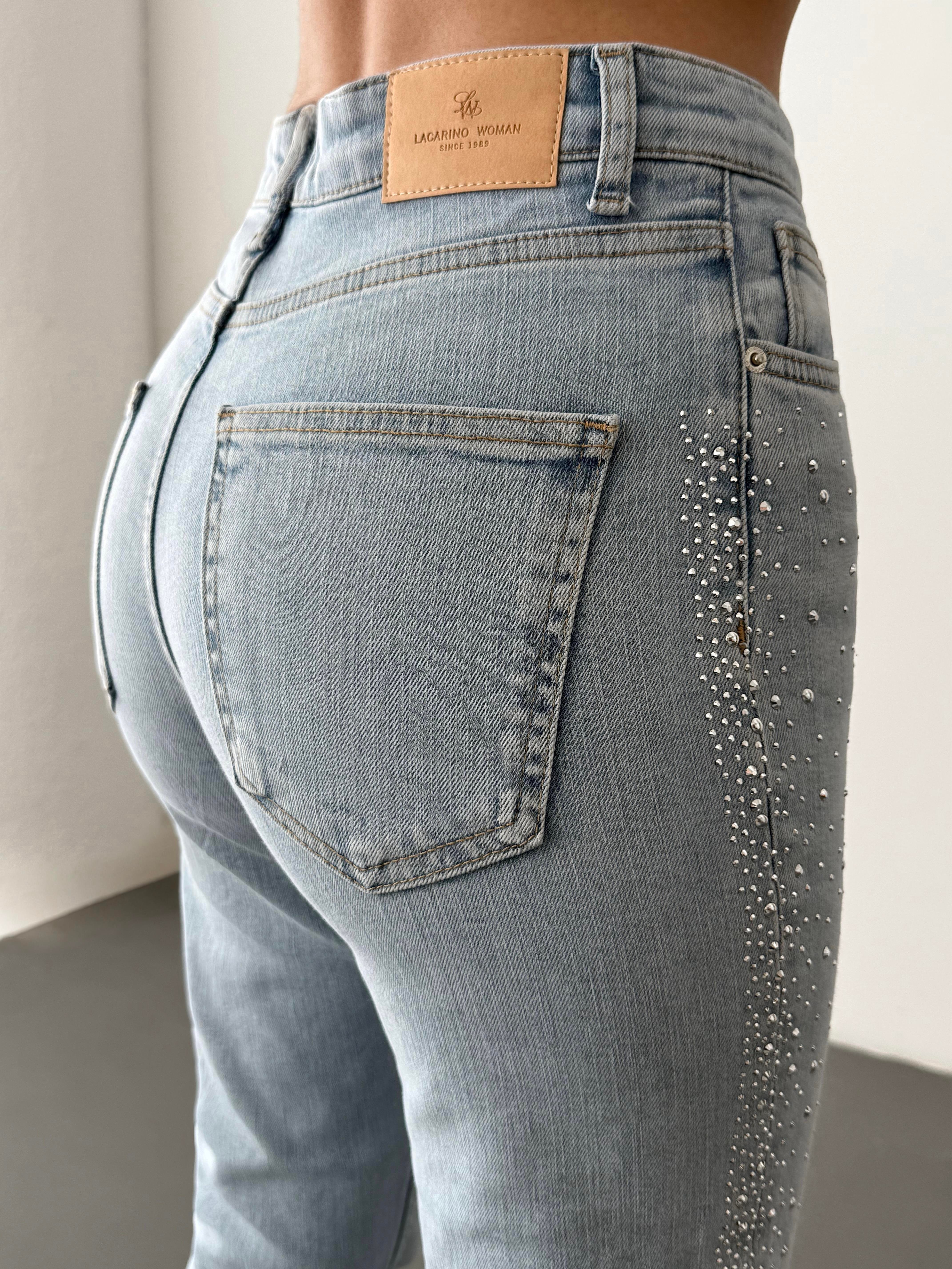 Джинсы прямого кроя цвета ''айс блю'' (ледяной синий) с деталями из камней. (STRAIGHTFIT-7949-ICET-34)